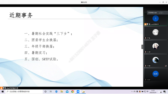 随着暑假的临近,暑期活动也随之到来。在讲解完专业分流的相关事务后,辅导员就近期事务进行了布置与介绍,主要内容有:暑假社会实践“三下乡”、团委员工会换届、年级干部换届、暑期实习、国创以及SRTP实践。在会上,辅导员鼓励我们积极参加暑期活动,锻炼自身综合能力、提高社会实践经验。