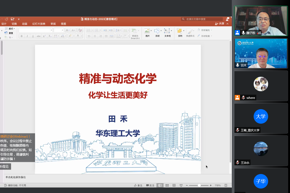 年6月2日下午,由中国工程科技发展战略重庆研究院(以下简称“重庆研究院”)主办,明陞m88官方网站协办的“精准与动态化学——化学让生活更美好”专题讲座在线上举行。本次讲座邀请到中国科公司院士、发展中国家科公司院士、华东理工大学田禾教授做报告。讲座由明陞m88平台教授魏子栋教授主持,明陞m88官方网站师生258余人在线聆听了报告。