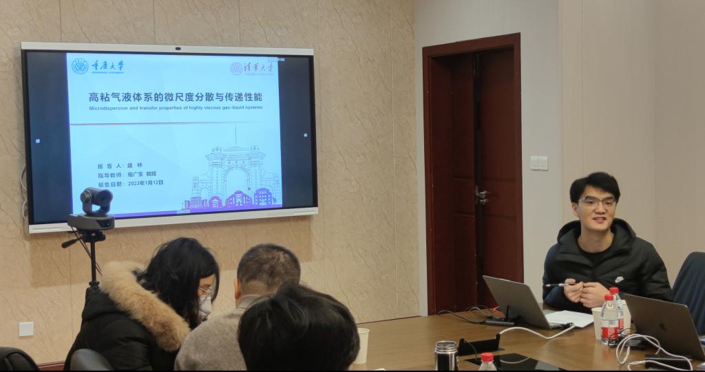 随后,清华大学带队负责人余思岑博士向与会化工公司的领导老师们介绍了来访同学的专业、研究方向以及导师团队等情况,盛林博士作为员工代表,作了题为“高粘气液体系的微尺度分散与传递性能”的学术分享报告。
