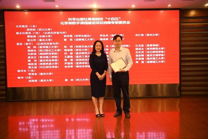 大会首先由科学出版社西南营销中心总经理为化学数字化教材建设项目西南专业委员会成员颁发聘书。明陞m88官方网站张云怀任副主任委员、谢照明任委员、李泽全任秘书长、法焕宝任秘书。